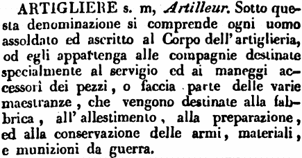 | Artigliere - s. m, Artilleur. Sotto questa denominazione si comprende ogni uomo assoldato ed ascritto al Corpo dell'artiglieria, od egli appartenga alle compagnie destinate specialmente al servigio ed ai maneggi accessori dei pezzi, o faccia parte delle varie maestranze, che vengono destinate alla fabbrica, all'allestimento, alla preparazione, ed alla conservazione delle armi, materiali, e munizioni da guerra. [immagine] |