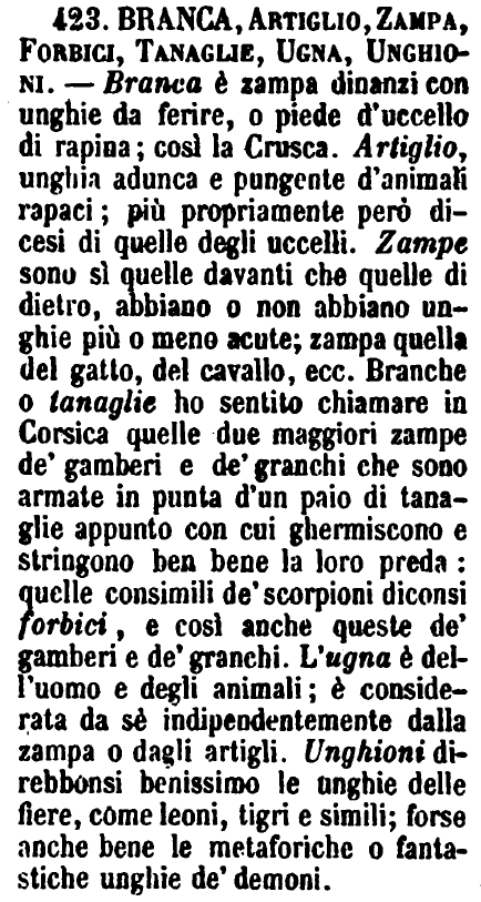 | Branca, Artiglio, Zampa, Forbici, Tanaglie, Ugna, Unghioni - Branca è zampa dinanzi con unghie da ferire, o piede d’uccello di rapina; così la Crusca. Artiglio, unghia adunca e pungente d’animali rapaci; più propriamente però dicesi di quelle degli uccelli. Zampe sono sì quelle davanti che quelle di dietro, abbiano o non abbiano unghie più o meno acute; zampa quella del gatto, del cavallo, ecc. Branche o tanaglie ho sentito chiamare in Corsica quelle due maggiori zampe de’ gamberi e de’ granchi che sono armate in punta d’un paio di tanaglie appunto con cui ghermiscono e stringono ben bene la loro preda: quelle consimili de’ scorpioni diconsi forbici, e così anche queste de’ gamberi e de’ granchi. L’ugna è dell’uomo e degli animali; è considerata da sé indipendentemente dalla zampa o dagli artigli. Unghioni direbbonsi benissimo le unghie delle fiere, come leoni, tigri e simili; forse anche bene le metaforiche o fantastiche unghie de’ demoni. [immagine] |