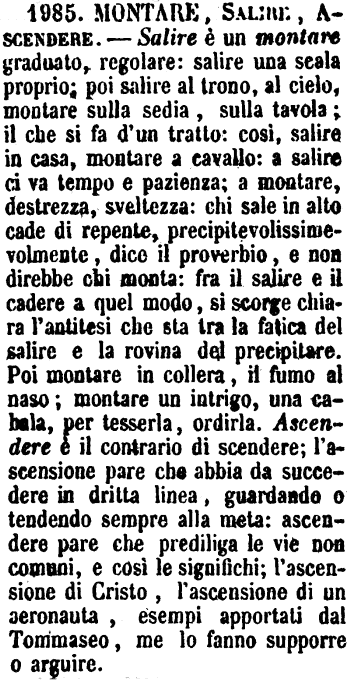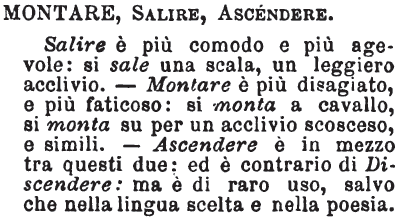 | Montare, Salire, Ascendere - Salire è più comodo e più agevole: si sale una scala, un leggiero acclivio. - Montare è più disagiato, e più faticoso: si monta a cavallo, si monta su per un acclivio scosceso e simili. - Ascendere è in mezzo tra questi due: ed è contrario di Discendere: ma è di raro uso, salvo che nella lingua scelta e nella poesia. [immagine] |