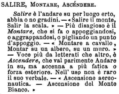 | Salire, Montare, Ascendere - Salire è l'andare su per luogo erto, abbia o no gradini. -«Salire il monte, Salir la scala. » - Più disagioso è il Montare, che si fa o appoggiandosi, o aggrappandosi, o pigliando un punto d'appoggio. - « Montare a cavallo, Montar su un albero, su un muro. » - Voce più da letterati che altro, è Ascendere, che val parimente Andare in su, ma accenna a più fatica o forza esteriore. Nell'uso non è raro il suo verbale. - « Ascensione aereonautica. - Ascensione del Monte Bianco. » [immagine] |