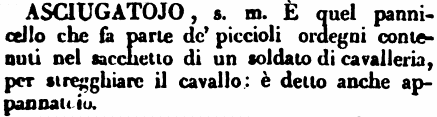 | Asciugatojo - s. m. È quel pannicello che fa parte de' piccioli ordegni contenuti nel sacchetto di un soldato di cavalleria, per stregghiare il cavallo: è detto anche appannatoio. [immagine] |