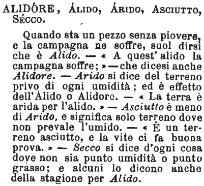 | Alidore, Alido, Arido, Asciutto, Secco - Quando sta un pezzo senza piovere, e la campagna ne soffre, suol dirsi che è Alido. - « A quest'alido la campagna soffre;» - che dicesi anche Alidore. - Arido si dice del terreno privo di ogni umidità; ed è effetto dell'Alido o Alidore. - « La terra è arida per l'alido.» - Asciutto è meno di Arido, e significa solo terreno dove non prevale l'umido. - « E' un terreno asciutto, e la vite ci fa buona prova.» - Secco si dice d'ogni cosa dove non sia punto umidità o punto grasso; e alcuni lo dicono anche della stagione per Alido. [immagine] |