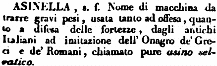 | Asinella - s. f. Nome di macchina da trarre gravi pesi, usata tanto ad offesa, quanto a difesa delle fortezze, dagli antichi Italiani ad imitazione dell'Onagro de' Greci e de' Romani, chiamato pure asino selvatico. [immagine] |