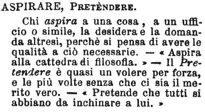 | Aspirare, Pretendere - Chi aspira a una cosa, a un ufficio o simile, la desidera e la domanda altresì, perchè si pensa di avere le qualità a ciò necessarie. - « Aspira alla cattedra di filosofia.» - Il Pretendere è quasi un volere per forza, e le più volte senza che ci sia il merito vero. - « Pretende che tutti si abbiano da inchinare a lui.» [immagine] |