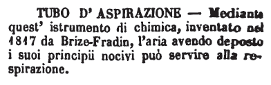 | Tubo d’aspirazione - Mediante quest'istrumento di chimica, inventato nel 1817 da Brize-Fradin, l'aria avendo deposto i suoi principii nocivi può servire alla respirazione. [immagine] |