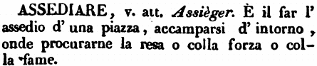 | Assediare - v. att. Assièger. È il far l'assedio d'una piazza, accamparsi d'intorno, onde procurarne la resa o colla forza o colla fame. [immagine] |