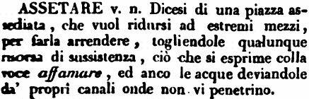 | Assetare - v. n. Dicesi di una piazza assediata, che vuol ridursi ad estremi mezzi, per farla arrendere, togliendole qualunque risorsa di sussistenza, ciò che si esprime colla voce affamare, ed anco le acque deviandole da' propri canali onde non vi penetrino. [immagine] |