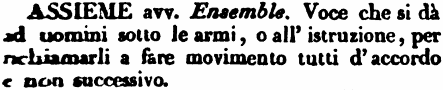 | Assieme - avv. Ensemble. Voce che si dà ad uomini sotto le armi, o all'istruzione, per richiamarli a fare movimento tutti d'accordo e non successivo. [immagine] |
