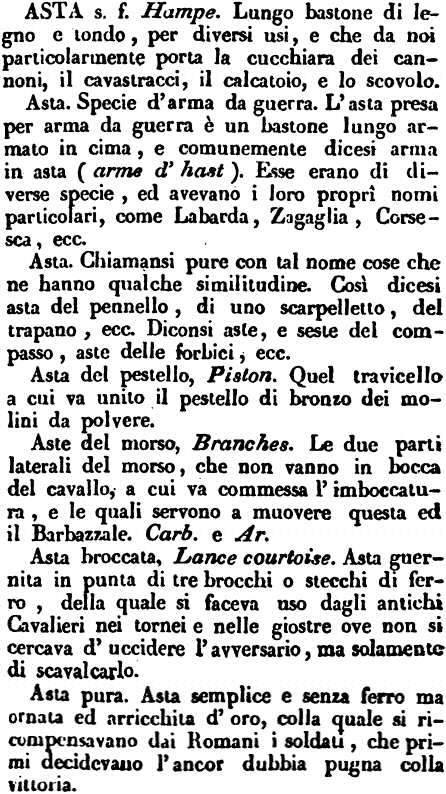 Asta. Specie d'arma da guerra. L'asta presa per arma da guerra è un bastone lungo armato in cima, e comunemente dicesi arma in asta (arme d'hast). Esse erano di diverse specie, ed avevano i loro proprî nomi particolari, come Labarda, Zagaglia, Corsesca, ecc. Asta. Chiamansi pure con tal nome cose che ne hanno qualche similitudine. Così dicesi asta del pennello, di uno scarpelletto, del trapano, ecc. Diconsi aste, e seste del compasso, aste delle forbici, ecc. Asta del pestello, Piston. Quel travicello a cui va unito il pestello di bronzo dei molini da polvere. Aste del morso, Branches. Le due parti laterali del morso, che non vanno in bocca del cavallo, a cui va commessa l'imboccatura, e le quali servono a muovere questa ed il Barbazzale. Carb.e Ar. Asta broccata, Lance courtoise. Asta guernita in punta di tre brocchi o stecchi di ferro, della quale si faceva uso dagli antichi Cavalieri nei tornei e nelle giostre ove non si cercava d'uccidere l'avversario, ma solamente di scavalcarlo. Asta pura. Asta semplice e senza ferro ma ornata ed arricchita d'oro, colla quale si ricompensavano dai Romani i soldati, che primi decidevano l'ancor dubbia pugna colla vittoria. [immagine] |