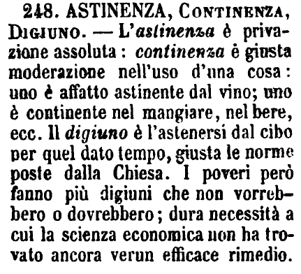 | Astinenza, Continenza, Digiuno - L'astinenza è privazione assoluta: continenza è giusta moderazione nell'uso d'una cosa: uno è affatto astinente dal vino; uno è continente nel mangiare, nel bere, ecc. Il digiuno è l'astenersi dal cibo per quel dato tempo, giusta le norme poste dalla Chiesa. I poveri però fanno più digiuni che non vorrebbero o dovrebbero; dura necessità a cui la scienza economica non ha trovato ancora verun efficace rimedio. [immagine] |