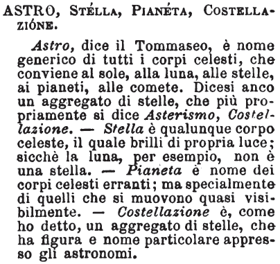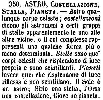 | Astro, Costellazione, Stella, Pianeta - Astro qualunque corpo celeste; costellazioni dicono gli astronomi a certi gruppi di stelle apparentemente le une alle altre vicine, e il cui complesso rappresenti una qualche forma più o meno determinata. Stelle sono que' corpi celesti che risplendono di luce propria e sono scintillanti. Pianeti invece quei che risplendono di luce riflessa e non scintillano. Il Sole è un astro; Sirio una stella, l'Orsa una costellazione, Giove un pianeta. [immagine] |