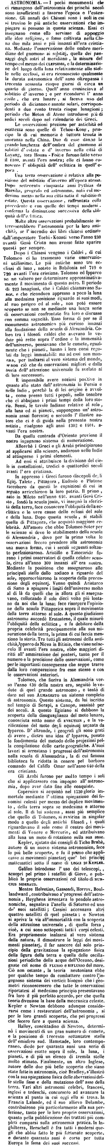 Le osservazioni preziose per antichità ed esattezza sono quelle di Tchou-Kong, principe la di cui memoria è tuttora tenuta in onoranza nella China. Due di esse danno la grande lunghezza dell'ombra del gnomone ai solstizi d'estate e d'inverno nella città di Loyang, (ora Houan-Foù) e furono fatte verso il 1100. avanti l'era nostra; elle ci fanno conoscere l'obliquità dell'eclittica in quell'epoca. Una terza osservazione è relativa alla posizione del solstizio d'inverno all'epoca stessa. Dopo settecento cinquanta anni Pythias da Marsilia, geografo ed astronomo, notò col medesimo mezzo nella sua città natia il solstizio di estate. Questa osservazione, raffrontata colla precedente e con quelle dei tempi moderni, conferma la diminuzione successiva della obliquità dell'eclittica. Molte altre osservazioni probabilmente interesserebbero l'astronomia per la loro antichità, se l'incendio dei libri Chinesi ordinato dall'imperatore Tochi-Koanti verso l'anno 230 avanti Gesù Cristo non avesse fatto sparire questi per sempre. Dopo i Chinesi vengono i Caldei, di cui Tolomeo ci ha trasmesso varie osservazioni utilissime. Le più antiche sono tre ecclissi di luna, notate in Babilonia nel 719 o 720 avanti l'era cristiana. Tolomeo ed Ipparco se ne valsero per determinare approssimativamente il movimento di questo astro. Il periodo di 223 lunagioni, che i Caldei chiamavano Saros. e che riconduce appresso a poco la luna alla medesima posizione riguardo ai suoi modi, al suo perigeo ed al sole, non potè essere scoperto se non se mediante una lunga serie di osservazioni confrontate fra loro e discusse con somma sagacità. Esso forma di per se il monumento astronomico più curioso innanzi alla fondazione della scuola di Alessandria. Coloro tra i filosofi caldei che avevano le vedute più rette sopra l'ordine e la immensità dell'universo, pensavano che le comete, egualmente che i pianeti, hanno i loro corsi regolati da leggi immutabili: ma ad essi non mancava, per inalzarsi al vero sistema del mondo, se non ciò che da osservazioni migliori e dalla teoria dell'attrazione universale fu svelato ai di loro successori. E' impossibile avere nozioni positive in quanto allo stato dell'astronomia in Persia e nelle Indie, perché la di lei origine è avvolta, come presso tutti i popoli, nelle tenebre che ci abbujano i primi tempi della loro storia. Bensi, le tavole Indiane relative al sole, alla luna ed ai pianeti, suppongono un'astronomia assai florente; e secondo l'illustre autore che ci è di guida nella presente nostra notizia, risalgono agli anni 1302 e 1401. avanti l'era nostra. Da quella contrada d'Oriente proviene il nostro ingegnoso sistema di numerazione. Allorché i Greci e gli Arabi principiarono ad applicarsi alle scienze, andarono nelle Indie ad attingerne i primi elementi. Ad essi si attribuisce la divisione del cielo in costellazioni, tredici o quattordici secoli avanti l'era cristiana. In appresso i Greci furono discepoli degli Egizj. Talete, Pittagora, Eudosio e Platone raccolsero da questi le cognizioni di cui in seguito arricchirono la loro patria. Il primo, nato in Mileto nell'anno 610. avanti Gesù Cristo, fondò la scuola jonia, vi insegnò la sfericità della terra, fece conoscere l'obliquità della ecclittica e le vere cause delle eclissi del sole e della luna. Dopo questa scuola, si stabilì quella di Pittagora, che acquistò maggiore celebrità. All'amore che ebbe Tolomeo Soter per le scienze si deve lo stabilimento della scuola di Alessandria, dove per la prima volta le osservazioni fecero prendere alla astronomia una nuova forma, cui i secoli seguenti soltanto perfezionarono. Aristillo e Timocaride furono i primi osservatori di quella celebre scuola, circa all'anno 300 innanzi all'era nostra. Mediante la posizione che assegnarono alle principali stelle dello zodiaco a riguardo del sole, apparecchiarono la scoperta della precessione degli equinozj. Venne quindi Aristarco di Samo a spingere i limiti dell'universo molto al di là da quelli che in allora gli si assegnavano, collocando il sole dieci volte più lontano da noi che la luna; fece risorgere l'opinione della scuola Pittagorica sopra il movimento della terra attorno al sole. A questo giudizioso astronomo succedè Eratostene, il quale misurò l'obliquità della eclittica, e fu debitore della propria celebrità precipuamente alla sua misurazione della terra, la prima di cui faccia menzione la storia. Tra tutti gli astronomi della antchità, Ipparco da Nicea in Bitinia, che visse nel secolo II avanti l'era nostra, ebbe maggiori diritti all'ammirazione dei posteri, tanto per il numero e la precisione delle osservazioni, come per le importanti conseguenze che seppe trarre dalla loro comparazione fra esse stesse e con le osservazioni anteriori. Tolomeo, che fioriva in Alessandria verso l'anno 130 della nostra era, seguitò le vedute di quel grande astronomo, e tentò di dare nel suo Almagesto un sistema completo di astronomia. Questo sistema, da lui iscritto nel tempio di Serapi, a Canope, sussistè per dei secoli. A questo Egiziano si debbono la scoperta della disuguaglianza del moto lunare, conosciuta sotto nome di evection, e la verificazione del moto degli equinozj segnata da Ipparco. D'altronde, i geografi gli sono grati di avere, dietro una idea d'Ipparco, posato le fondamenta del metodo delle projezioni pella compilazione delle carte geografiche. A' suoi lavori si arrestano i progressi dell'astronomia nella scuola di Alessandria, la di cui famosa biblioteca fu ridotta in cenere pel barbaro comando del Califfo Omar nell'anno 640 della era cristiana. Gli Arabi furono per molto tempo i soli che si applicassero con impegno all'astronomia, dopo aver dato fine alle conquiste. Copernico si acquistò nel 1530 gloria immortale mediante l'ottima spiegazione dei fenomini celesti per mezzo del duplice movimento, della terra sopra se medesima e attorno al sole. Il di lui sistema, assai più semplice che quello di Tolomeo, si avvicina in si