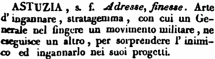 | Astuzia - s.f. Adresse, finesse. Arte d'ingannare, stratagemma, con cui un Generale nel fingere un movimento militare, ne eseguisce un altro, per sorprendere l'inimico ed ingannarlo nei suoi progetti. [immagine] |