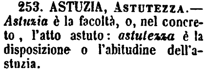 | Astuzia, Astutezza - Astuzia è la facoltà, o, nel concreto, l'atto astuto: astutezza è la disposizione o l'abitudine dell'astuzia. [immagine] |