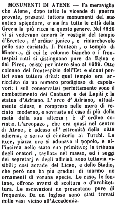 | Monumenti di Atene - Fa meraviglia che Atene, dopo tutte le vicende di guerra provate, presenti tuttora monumenti del suo antico splendore, e sia fra tutte le città della Grecia la più ricca in questo genere. Nel 1826 vi si vedevano ancora le vestigia del tempio d'Erecteo, d'ordine jonico, e rimarchevole pelle sue cariatidi. Il Panteon, o tempio di Minerva, di cui le colonne bianche e i frontespizi rotti si distinguono pure da Egina e dal Pireo, esistè per intero sino al 1689. Otto colonne del frontespizio dell'Est e alcuni portici sono tuttora dritti: quel tempio era arricchito da un numero prodigioso di capolavori; i soli conservatisi perfettamente sono il combattimento dei Centauri e dei Lapiti e la statua d'Adriano. L'arco d'Adriano, attualmente chiuso, è compreso nelle mura di recinto moderno, e sovrasta ad esse di più della metà della sua altezza; è d'ordine corintio. L'areopago, che era quasi nel centro di Atene, è adesso all'estremità della città odierna, e serve di cimiterio ai Turchi. La pace, piazza ove si adunava il popolo, è all'incirca nello stato suo primitivo; la tribuna degli oratori, tagliata nel masso ed i seggi dei segretarj e degli ufficiali sono tuttavia visibili; così accade del Liceo, e dello Stadio, che però non ha più gradini di marmo nè ornamenti di veruna specie. Le case, le fontane, offrono avanzi di scoltura o d'architettura. Le escavazioni ne presentano pure di frequente. Da un Inglese sono stati trovati mille vasi vicino all'Accademia. [immagine] |