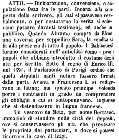 Atto - Dichiarazione, convenzione, o stipulazione fatta fra le parti. Innanzi alla scoperta dello scrivere, gli atti si passavano verbalmente, e per costatarne la verità si solevano passare davanti testimonj, ed anche in pubblico. Quando Abramo compra da Efron una caverna per seppellire Sara, la vendita si fa alla presenza di tutto il popolo. I Babilonesi furono considerati nell'antichità come i primi popoli che abbiano introdotto il costume degli atti per iscritto. Sotto il regno di Enrico III. nel 1591, il Parlamento di Parigi ordinò che quelli stipulati nanti notaro fossero firmati dalle parti. Avanti a Francesco I. si redigevano in latino; ma questo principe volendo porre i contraenti in grado da comprendere gli obblighi a cui si sottoponevano, ingiunse che si distendessero in lingua francese.