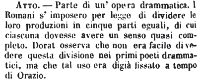 | Atto - Parte di un'opera drammatica. I Romani s'imposero per legge di dividere le loro produzioni in cinque parti eguali, di cui ciascuna dovesse avere un senso quasi completo. Dorat osserva che non era facile di vedere questa divisione nei primi poeti drammatici, ma che tal uso era digià fissato a tempo di Orazio. [immagine] |