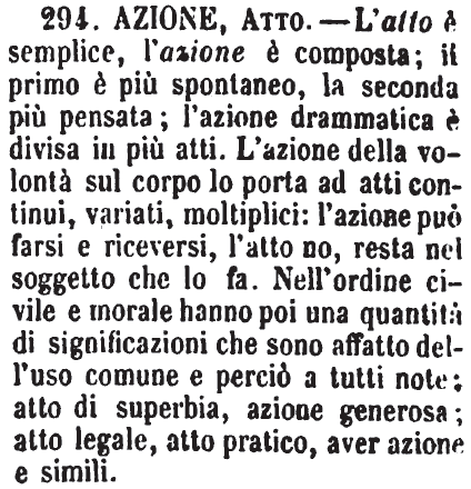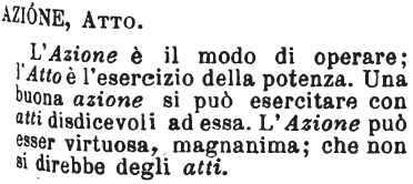 | Azione, Atto - L'Azione è il modo di operare; l'Atto è l'esercizio della potenza. Una buona azione si può esercitare con atti disdicevoli ad essa. L'Azione può esser virtuosa, magnanima; che non si direbbe degli atti. [immagine] |