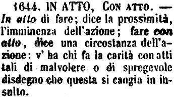 | In atto, Con atto - In atto di fare; dice la prossimità, l'imminenza dell'azione; fare con atto, dice una circostanza dell'azione: v'ha chi fa la carità con atti tali di malvolere o di spregevole disdegno che questa si cangia in insulto. [immagine] |
