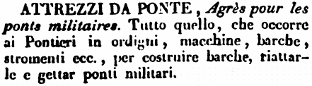 | Attrezzi da ponte - Agrès pour les ponts militaires. Tutto quello, che occorre ai Pontieri in ordigni, macchine, barche, stromenti ecc., per costruire barche, riattarle e gettar ponti militari. [immagine] |