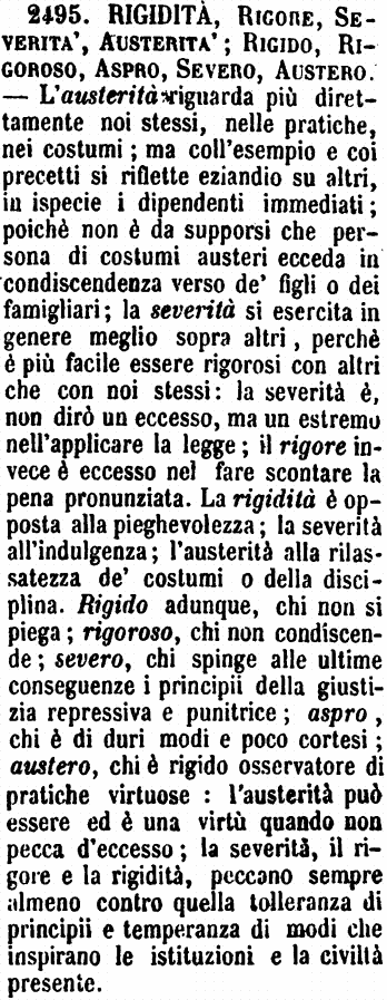 | Rigidità, Rigore, Severità, Austerità; Rigido, Rigoroso, Aspro, Severo, Austero - L'austerità riguarda più direttamente noi stessi, nelle pratiche, nei costumi; ma coll'esempio e coi precetti si riflette eziandio su altri, in ispecie i dipendenti immediati; poichè non è da supporsi che persona di costumi austeri ecceda in condiscendenza verso de' figli o dei famigliari; la severità si esercita in genere meglio sopra altri, perchè è più facile essere rigorosi con altri che con noi stessi: la severità è, non dirò un eccesso, ma un estremo nell'applicare la legge; il rigore invece è eccesso nel fare scontare la pena pronunziata. La rigidità è opposta alla pieghevolezza; la severità all'indulgenza; l'austerità alla rilassatezza de' costumi o della disciplina. Rigido adunque, chi non si piega, rigoroso, chi non condiscende; severo, chi spinge alle ultime conseguenze i principii della giustizia repressiva e punitrice; aspro, chi è di duri modi e poco cortesi; austero, chi è rigido osservatore di pratiche virtuose: l'austerità può essere ed è una virtù quando non pecca d'eccesso; la severità, il rigore e la rigidità, peccano sempre almeno contro quella tolleranza di principii e temperanza di modi che inspirano le istituzioni e la civiltà presente. [immagine] |