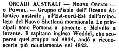 Al Polo Australe in velocipede di Emilio Salgari (1895): Il numero esatto forse non si conosce ancora, essendo state visitate da pochi navigatori, da Delaroche nel 1675 che pel primo scoprì l'isola del Re Giorgio, da Powell nel 1825, da Foster che prendeva possesso delle terre australi nel 1829, e da Biscoe, lo scopritore della Terra di Enderby, di quella d'Adelaide e di quella di Graham nel suo viaggio del 1832. |