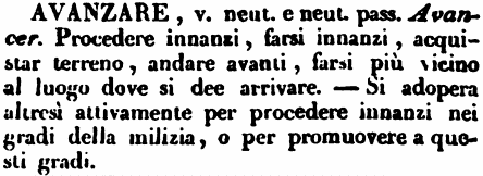 | Avanzare - v. neut. e neut. pass. Avancer. Procedere innanzi, farsi innanzi, acquistar terreno, andare avanti, farsi più vicino al luogo dove si dee arrivare. - Si adopera altresì attivamente per procedere innanzi nei gradi della milizia, o per promuovere a questi gradi. [immagine] |