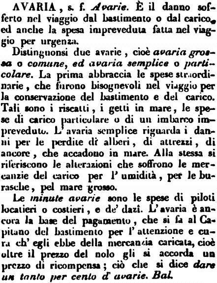 | Avaria - s. f. Avarie. È il danno sofferto nel viaggio dal bastimento o dal carico, ed anche la spesa impreveduta fatta nel viaggio per urgenza.