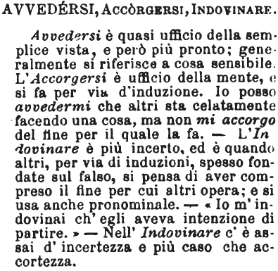 | Avvedersi, Accorgersi, Indovinare - Avvedersi è quasi ufficio della semplice vista, e però più pronto; generalmente si riferisce a cosa sensibile. L' Accorgersi è ufficio della mente, e si fa per via d'induzione. Io posso avvedermi che altri sta celatamente facendo una cosa, ma non mi accorgo del fine per il quale la fa. - L'Indovinare è più incerto, ed è quando altri, per via di induzioni, spesso fondate sul falso, si pensa di aver compreso il fine per cui altri opera; e si usa anche pronominale. - «Io m'indovinai ch'egli aveva intenzione di partire.» - Nell'Indovinare c'è assai d'incertezza e più caso che accortezza. [immagine] |