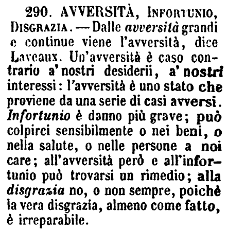 | Avversità, Infortunio, Disgrazia - Dalle avversità grandi e continue viene l'avversità, dice Laveaux. Un'avversità è caso contrario a' nostri desiderii, a' nostri interessi: l'avversità è uno stato che proviene da una serie di casi avversi. Infortunio è danno più grave; può colpirci sensibilmente o nei beni, o nella salute, o nelle persone a noi care; all'avversità però e all'infortunio può trovarsi un rimedio; alla disgrazia no, o non sempre, poichè la vera disgrazia, almeno come fatto, è irreparabile. [immagine] |