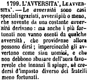 | L’avversità, Le avversità - Le avversità sono casi speciali sgraziati, avversi più o meno, che sovente da una costante avversità derivano: ma anche i più fortunati non vanno esenti da qualche avversità, che providenze allora possono dirsi; imperciocchè gli avvertono come sian uomini, e che non debbono abusare dell'aura favorevole che innanzi li spinge, nè credersi d'impasto diverso dei fratelli meno fortunati. [immagine] |