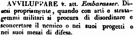 | Avviluppare - v. att. Embarasser. Dicesi propriamente, quando con arti e stratagemmi militari si procura di disordinare e sconcertare il nemico o nei suoi progetti o nei suoi mezzi di difesa. [immagine] |
