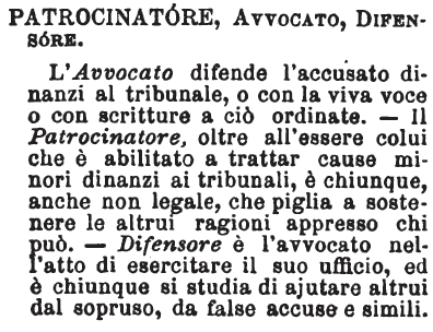 | Patrocinatore, Avvocato, Legale, Giureconsulto, Giurisperito - Tutti gli avvocati non sono patrocinatori; ve ne sarebbero allora più che litiganti; tutti i patrocinatori non sono avvocati; e certi gentili patrocinatori talora vincono più facilmente di tali punti, che non i più valenti oratori; qui parlo a chi conosce l'eloquenza di uno sguardo, di una dolce parolina. Legale è l'uomo di legge, cioè colui che la studia, la sa, l'interpreta, l'applica: si dice in genere dell'avvocato patrocinatore: vo dal mio legale. Giureconsulto è di solito avvocato provetto e maturo al quale si suol ricorrere per consigli e consulti legali per l'appunto intorno a casi dubbii e difficili. Questi ha da essere giurisperito, cioè profondo conoscitore del diritto, della legge e della giurisprudenza. [immagine] |