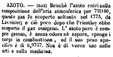 | Azoto (gaz) - Benchè l'azoto entri nella composizione dell'aria atmosferica per 79/100, questo gaz fu scoperto soltanto nel 1775, da Lavoisier; e ciò poco dopo che Priestley ebbe scoperto il gaz ossigeno. L'azoto puro è sempre gazoso, è senza odore nè sapore, spenge i corpi in combustione, ed il suo peso specifico è di 0,9757. Non è di verun uso nelle arti e nella medicina. [immagine] |