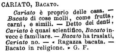 | Cariato, Bacato - Cariato è proprio delle ossa. - Bacato di cose molli, come frutta, carni, e simili. - Detto dei denti, Cariato è quasi scientifico, Bacato invece è familiare. - Bacato ha traslati, Cariato no. - «Ragazza bacata. - Bacato in religione.» G. F. [immagine] |
