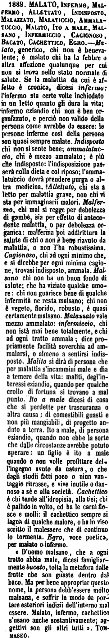 | Malato, Infermo, Malfermo, Allettato, Indisposto, Malazzato, Malaticcio, Ammalatuccio, Malito, Ito a male, Malsano, Infermiccio, Cagionoso, Bacato, Cachettico, Egro - Malato, generico, chi non è benevalente; è malato chi ha la febbre o altra affezione qualunque per cui non si trova nello stato normale di salute. Se la malattia da cui è affetto è cronica, dicesi infermo: l'infermo sta certe volte inchiodato in un letto quanto gli dura la vita; infermo eziandio chi non è ben organizzato, e perciò non valido della persona come avrebbe da essere: le persone inferme così della persona son quasi sempre malate. Indisposto chi non si sente bene; ammalatuccio, chi è mezzo ammalato; è più che indisposto: l'indisposizione passerà colla dieta e col riposo; l'ammalatuccio dovrà prendere purga o altra medicina. Allettato, chi sta a letto per malattia grave, non chi vi sta per immaginarii malori. Malfermo, chi mal si regge per debolezza di gambe, sia per effetto di antecedente malattia, o per debolezza organica: malferma poi addirittura la salute di chi o non è bene riavuto da malattia, o non l'ha robustissima. Cagionoso, chi ad ogni minimo che, e si direbbe per ogni minima cagione, trovasi indisposto, ammala. Malsano chi non ha un buon fondo di salute; che ha viziato qualche umore: chi non guarisce bene di qualche infermità ne resta malsano; chi non è vegeto, florido, robusto, è quasi certamente malsano. Malazzato vale mezzo ammalato: infermiccio, chi non istà mai bene totalmente, e chi ad ogni tratto ammala; dice propriamente facilità soverchia ad ammalarsi, o almeno a sentirsi indisposto. Malito si dirà di persona che per malattia s'incammini male e dia a temere della vita: maliti, degl'interessi eziandio, quando per qualche crollo di fortuna si trovano a mal punto. Ito a male dicesi di cosa che si perdette per trascuranza o altra causa; di comestibili guasti e non più mangiabili, di progetto andato a terra. Ito a male, di persona eziandio, quando non ebbe la sorte che dalle circostanze avrebbe potuto sperare: un figlio è ito a male quando o non volle profittare dell'ingegno avuto da natura, o che dagli studii fatti poco o niun vantaggio ritrasse, e vive inutile o dannoso a sè e alla società. Cachettico è chi tende all'idropisia, alla tisi; chi è pallido in volto, ed ha le carni flosce e molli: il cachettico sempre si lagna di qualche malore, o ha in viso scritto il malessere che di continuo lo tormenta. Egro, voce poetica, per malato o infermo.