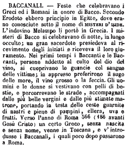 | Baccanali - Feste, che i Romani celebravano in onore di Bacco, ad imitazione delle Orgie de' Greci. (Vedi Orgie). |