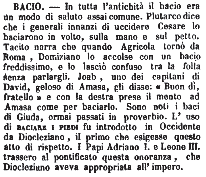| Bacio - In tutta l'antichità il bacio era un modo di saluto assai comune. Plutarco dice che i generali innanzi di uccidere Cesare lo baciarono in volto, sulla mano e sul petto. Tacito narra che quando Agricola tornò da Roma, Domiziano lo accolse con un bacio freddissimo, e lo lasciò confuso tra la folla senza parlargli. Joab, uno dei capitani di David, geloso di Amasa, gli disse: «Buon dì, fratello» e con la destra prese il mento ad Amasa come per baciarlo. Sono noti i baci di Giuda, ormai passati in proverbio. L'uso di baciare i piedi fu introdotto in Occidente da Diocleziano, il primo che esigesse questo atto di rispetto. I Papi Adriano I. e Leone III. trassero al pontificato questa onoranza, che Diocleziano aveva appropriata all'impero. [immagine] |