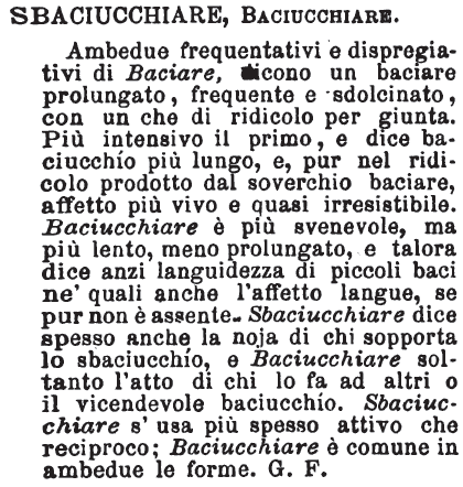 | Sbaciucchiare, Baciucchiare - Ambedue frequentativi e dispregiativi di Baciare, dicono un baciare prolungato, frequente e sdolcinato, con un che di ridicolo per giunta. Più intensivo il primo, e dice baciucchío più lungo, e, pur nel ridicolo prodotto dal soverchio baciare, affetto più vivo e quasi irresistibile. Baciucchiare è più svenevole, ma più lento, meno prolungato, e talora dice anzi languidezza di piccoli baci ne' quali anche l'affetto langue, se pur non è assente. Sbaciucchiare dice spesso anche la noja di chi sopporta lo sbaciucchío, e Baciucchiare soltanto l'atto di chi lo fa ad altri o il vicendevole bachiucchío. Sbaciucchiare s'usa più spesso attivo che reciproco; Baciucchiare è comune in ambedue le forme. G. F. [immagine] |