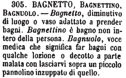 | Bagnetto, Bagnettino, Bagnuolo - Bagnetto, diminutivo di luogo o vaso adattato a prender bagni. Bagnettino è bagno non intero della persona. Bagnuolo, voce medica che significa far bagni con qualche lozione o decotto a parte malata con lasciarvi sopra un piccolo pannolino inzuppato di quello. [immagine] |