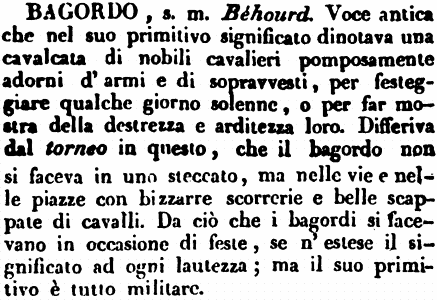 | Bagordo - s. m. Béhourd. Voce antica che nel suo primitivo significato dinotava una cavalcata di nobili cavalieri pomposamente adorni d'armi e di sopravvesti, per festeggiare qualche giorno solenne, o per far mostra della destrezza e arditezza loro. Differiva dal torneo in questo, che il bagordo non si faceva in uno steccato, ma nelle vie e nelle piazze con bizzarre scorrerie e belle scappate di cavalli. Da ciò che i bagordi si facevano in occasione di feste, se n'estese il significato ad ogni lautezza; ma il suo primitivo è tutto militare. [immagine] |