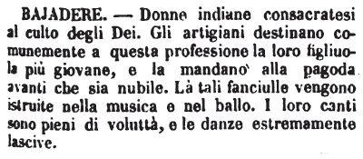 | Bajadere - Donne indiane consacratesi al culto degli Dei. Gli artigiani destinano comunemente a questa professione la loro figliuola più giovane, e la mandano alla pagoda avanti che sia nubile. Là tali fanciulle vengono istruite nella musica e nel ballo. I loro canti sono pieni di voluttà, e le danze estremamente lascive. [immagine] |