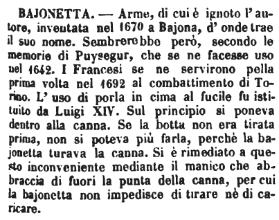 | Bajonetta - Arme, di cui è ignoto l'autore, inventata nel 1670 a Bajona, d'onde trae il suo nome. Sembrerebbe però, secondo le memorie di Puysegur, che se ne facesse uso nel 1642. I Francesi se ne servirono pella prima volta nel 1692 al combattimento di Torino. L'uso di porla in cima al fucile fu istituito da Luigi XIV. Sul principio si poneva dentro alla canna. Se la botta non era tirata prima, non si poteva più farla, perchè la bajonetta turava la canna. Si è rimediato a questo inconveniente mediante il manico che abbraccia di fuori la punta della canna, per cui la bajonetta non impedisce di tirare nè di caricare. [immagine] |