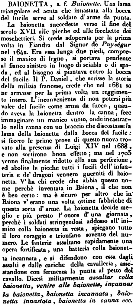La baionetta succedette verso il fine del secolo XVII alle picche ed alle forchette dei moschettieri. Si crede adoperata per la prima volta in Fiandra dal Signor de Puységur nel 1642. Era essa lunga due piedi, compreso il manico di legno, si portava pendente al fianco sinistro in luogo di sciabla o di spada, ed al bisogno si piantava entro la bocca del fucile. Il P. Daniel, che scrisse la storia della milizia francese, crede che nel 1681 se ne armasse per la prima volta un reggimento intero. L'inconveniente di non potersi più valer del fucile come arma da fuoco, quando aveva la baionetta dentro la canna, fece immaginare un manico vuoto, onde incastrarlo nella canna con un braccio che discostasse la lama della baionetta dalla bocca del fucile: si fecero le prime prove di questo nuovo trovato alla presenza di Luigi XIV nel 1688, e non sortirono buon effetto; ma nel 1703 venne finalmente ridotto alla sua perfezione, ed abolite le picche tutti i fucili dell'infanteria e de' dragoni vennero guerniti di baionetta. V'ha chi crede che abbia questo nome perchè inventata in Baiona, il che non è ben certo: ma è sicuro per altro che in Baiona v'erano una volta ottime fabbriche di questa sorta d'arme. La baionetta decide meglio e più presto l'onore d'una giornata, perchè i soldati stringendosi addosso all'inimico colla baionetta in resta, spiegano tutto il loro coraggio e trionfano sovente del numero. Le fanterie assaltano rapidamente una opera fortificata, una batteria colla baionetta incannata, e si difendono con essa dagli assalti e dalle cariche della cavalleria, assestandone con fermezza la punta al petto del cavallo. Dicesi militarmente assaltar colla baionetta, venire alle baionette, incannar la baionetta, baionetta incannata, baionetta innastata, baionetta in canna ecc. [immagine] |