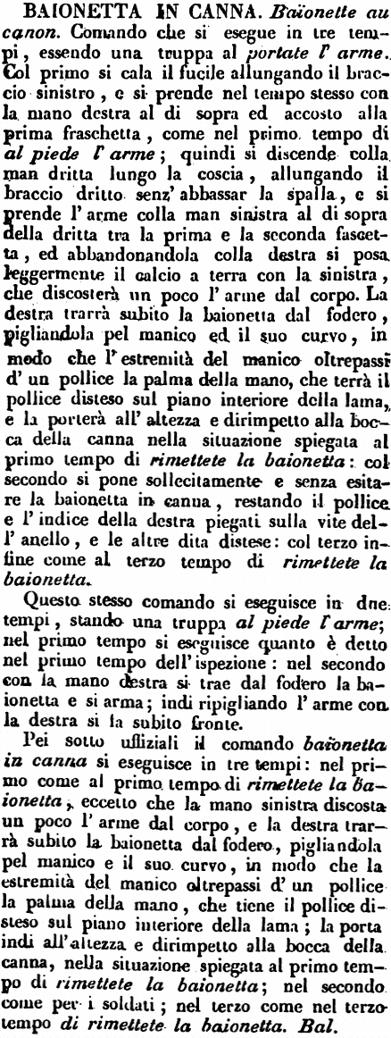 Baionetta in canna - Baïonette au canon. Comando che si esegue in tre tempi, essendo una truppa al portate l'arme. Col primo si cala il fucile allungando il braccio sinistro, e si prende nel tempo stesso con la mano destra al di sopra ed accosto alla prima fraschetta, come nel primo tempo di al piede l'arme; quindi si discende colla man dritta lungo la coscia, allungando il braccio dritto senz'abbassar la spalla, e si prende l'arme colla man sinistra al di sopra della dritta tra la prima e la seconda fascetta, ed abbandonandola colla destra si posa leggermente il calcio a terra con la sinistra, che discosterà un poco l'arme dal corpo. La destra trarrà subito la baionetta dal fodero, pigliandola pel manico ed il suo curvo, in modo che l'estremità del manico oltrepassi d'un pollice la palma della mano, che terrà il pollice disteso sul piano interiore della lama, e la porterà all'altezza e dirimpetto alla bocca della canna nella situazione spiegata al primo tempo di rimettete la baionetta: col secondo si pone sollecitamente e senza esitare la baionetta in canna, restando il pollice e l'indice della destra piegati sulla vite dell'anello, e le altre dita distese: col terzo infine come al terzo tempo di rimettete la baionetta.