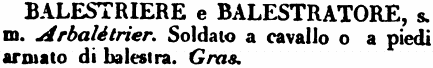 | Balestriere e Balestratore - s. m. Arbalétrier. Soldato a cavallo o a piedi armato di balestra. Gras. [immagine] |