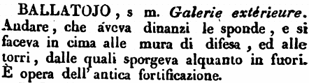 | Ballatojo - s. m. Galerie extérieure. Andare, che aveva dinanzi le sponde, e si faceva in cima alle mura di difesa, ed alle torri, dalle quali sporgeva alquanto in fuori. É opera dell'antica fortificazione. [immagine] |