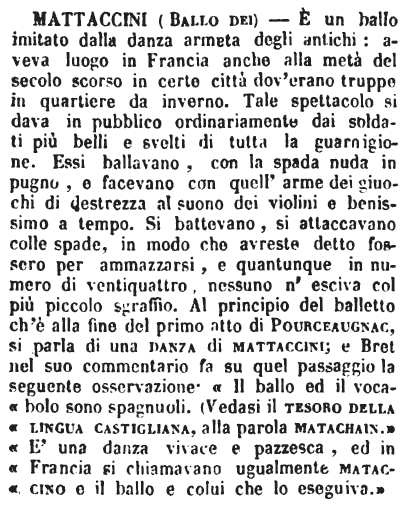| Mattaccini (Ballo dei) - E' un ballo imitato dalla danza armata degli antichi: aveva luogo in Francia anche alla metà del secolo scorso in certe città dov'erano truppe in quartiere da inverno. Tale spettacolo si dava in pubblico ordinariamente dai soldati più belli e svelti di tutta la guarnigione. Essi ballavano, con la spada nuda in pugno, e facevano con quell'arme dei giuochi di destrezza al suono dei violini e benissimo a tempo. Si battevano, si attaccavano colle spade, in modo che avreste detto fossero per ammazzarsi, e quantunque in numero di ventiquattro, nessuno n'esciva col più piccolo sgraffio. Al principio del balletto ch'è alla fine del primo atto di Pourceaugnac, si parla di una danza di mattaccini; e Bret nel suo commentario fa su quel passaggio la seguente osservazione: «Il ballo ed il vocabolo sono spagnuoli. (Vedasi il tesoro della lingua castigliana, alla parola matachain.» «E' una danza vivace e pazzesca, ed in Francia si chiamavano ugualmente mataccino e il ballo e colui che lo eseguiva.» [immagine] |