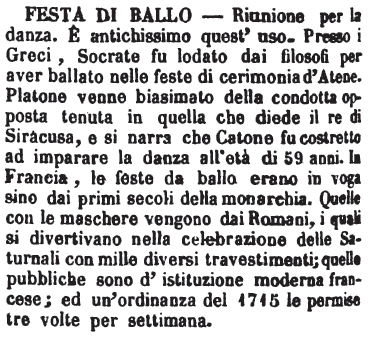 | Festa di ballo - Riunione per la danza. E' antichissimo quest'uso. Presso i Greci, Socrate fu lodato dai filosofi per aver ballato nelle feste di cerimonia d'Atene. Platone venne biasimato della condotta opposta tenuta in quella che diede il re di Siracusa, e si narra che Catone fu costretto ad imparare la danza all'età di 59 anni. In Francia, le feste da ballo erano in voga sino dai primi secoli della monarchia. Quelle con le maschere vengono dai Romani, i quali si divertivano nella celebrazione delle Saturnali con mille diversi travestimenti; quelle pubbliche sono d'istituzione moderna francese; ed un'ordinanza del 1715 le permise tre volte per settimana. [immagine] |