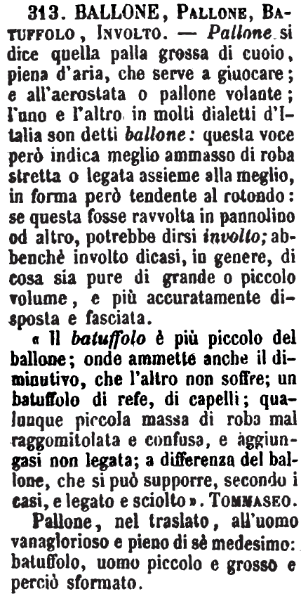 Ballone, Pallone, Batuffolo, Involto - Pallone si dice quella palla grossa di cuoio, piena d'aria, che serve a giuocare; e all'aerostata o pallone volante; l'uno e l'altro in molti dialetti d'Italia son detti ballone: questa voce però indica meglio ammasso di roba stretta o legata assieme alla meglio, in forma però tendente al rotondo: se questa fosse ravvolta in pannolino od altro, potrebbe dirsi involto; abbenchè involto dicasi, in genere, di cosa sia pure di grande o piccolo volume, e più accuratamente disposta e fasciata.